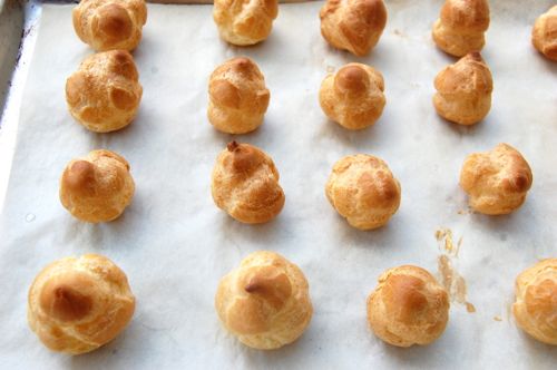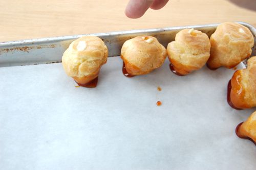 Now I rest the puffs — top side down — on yet another parchment-lined baking sheet, leaning them against the edges so they don’t roll over. If you don’t like those little flat tops, you can set the puffs right-side-up instead. I like those odd little shapes, myself. They not only look vaguely sculptural, they provide your guests with a nice, greedy bite of caramel candy. Oh that’s good.