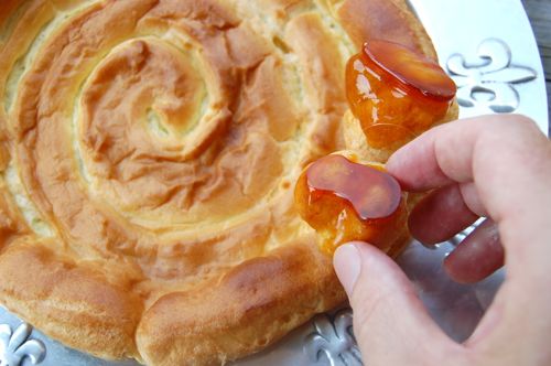 …then with a pastry bag — with no tip or collar — I gently pipe large blobs of filling into the center in no particular pattern. (Forgive me for not showing this, but it was 95 with 90% humidity yesterday, and the chiboust was melting fast in the oppressive environment…plus my girls were trying to hit me with water balloons — all in all less than ideal conditions for pastry making).