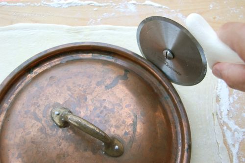 …then I place a 9″ to 10″ form — like this tarnished pot lid — over the sheet. I trim around it with a pizza cutter.