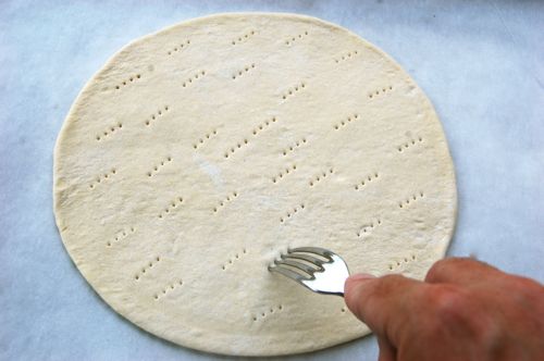 I then dock the circle with a fork to keep it from rising very much. I stick that in the fridge on a parchment-lined sheet pan while I prepare the choux.