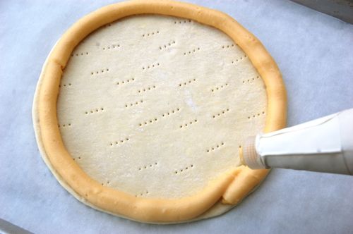 When the choux is ready, I load it into a piping bag with just the collar (no tip) and pipe a thick line around the edge. I press the bag firmly and remember to hold the tip of the bag about an inch from the piping surface. I don’t extrude the batter, I let it fall from the tip.