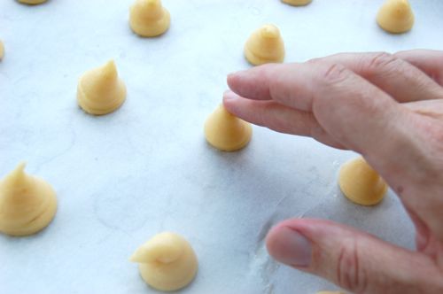 Now I go over to a second parchment-lined sheet pan and pipe some cream puffs, about 18 of them. With a lightly moistened fingertip, I pat down any pointy bits.