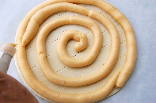 Now I return to the pastry circle, and with any remaining batter I pipe a curlicue in the middle of the circle. This is mostly just to use up batter and fill space. If you don’t pipe this perfectly it’s no big deal…at all.