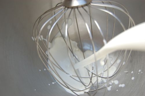 The next part of the process is like a little dance. The idea is to have the purée at the perfect temperature and the cream at the perfect consistency right at the same time. Since cooling the purée all the way right away will cause the gelatin to set up prematurely, and whipping the cream all the way right away risks a semi-melted or over-whipped end product, you want to do each in stages. So, while the purée is cooling, pour the cream into the bowl of a mixer fitted with a whip.