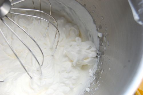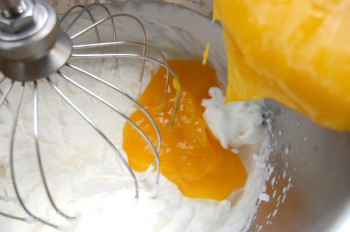 Whip it. Meanwhile, prepare an ice water bath for the bowl of mango purée. When the cream is whipped more or less to soft peaks…