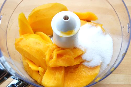 but i put 3 tablespoons of water and 1 envelope of unflavored gelatin in microwave for 30 seconds~ cool and add to mango puree along w/ 1/2 cup of sugar.