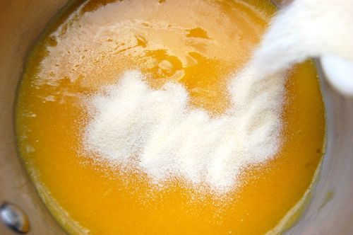 Now pour one third of the purée into a small saucepan and bring it up to a simmer. Sprinkle on the gelatin…