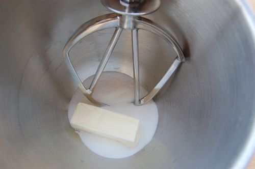 For a first attempt at melon pan, I was pretty pleased with these. Little 4-year-old Joan Pastry certainly was. Judging by her level of enthusiasm I’ll be making these quite a bit in future. But a very interesting item melon pan is. It’s not terribly sweet, nor does it have an especially pronounced flavor. However the textures are extremely interesting, and that jibes with what I know of Japan. Food lovers there are every bit as excited by texture as they are by flavor, perhaps even more so. Begin your melon by preparing the cookie dough. Put the butter and sugar in the bowl of a mixer fitted with a paddle (beater):