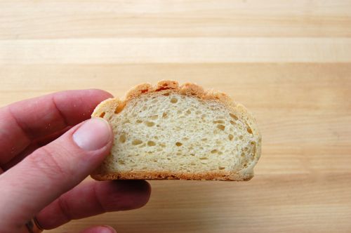 There, not too hard, was it? Let these proof for about 45 minutes to an hour. Meanwhile, preheat your oven to 375. Bake on the middle rack for about 20 minutes until lightly browned on the top. Eat warm, because they’re fantastic that way. Here’s what they look like on the inside, light and fluffy surrounded by a crispy cookie shell: