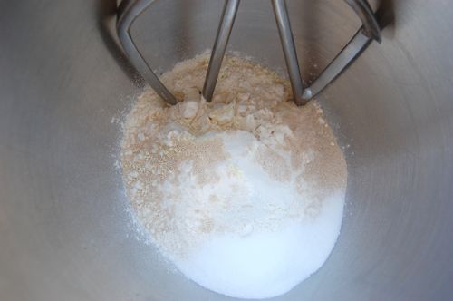Next, prepare the buns. Clean the mixer bowl and combine all the dry ingredients in it, then affix the paddle (beater).