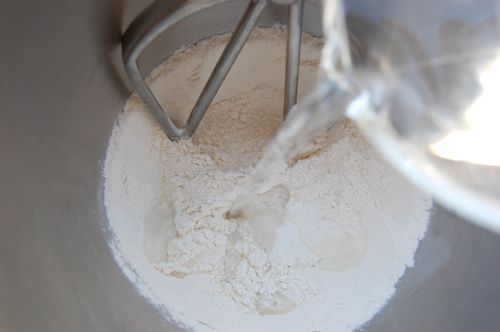 Stir the mixture to combine everything, then turn the speed up to medium and add the water.