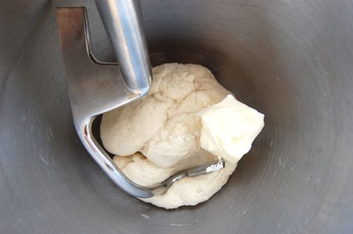 Knead for about five minutes on medium, you’ll notice the dough getting quite a bit smoother. Add the butter and knead to incorporate. It might take a bit longer than you hope, since the butter will cause the dough to slip around the inside of the bowl for a while. Continue until the sides of the bowl are once again clean. The dough will be very soft and slightly greasy.