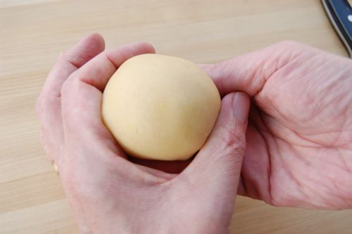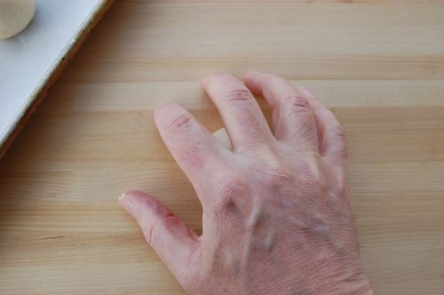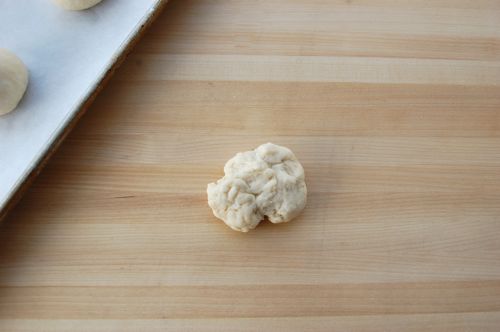 Roll them into balls on a wooden board or counter top, you may not need any flour at all. (I can very easily imagine inserting a few chocolate chips or some other small quantity of filling into the center of the dough at this point).