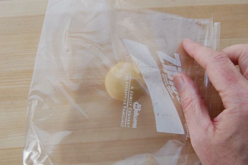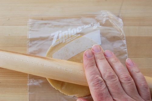 Roll it into a ball and put the ball between two sheets of plastic. Thicker plastic is easier to work with. Here I’ve opened up a Ziploc with scissors.