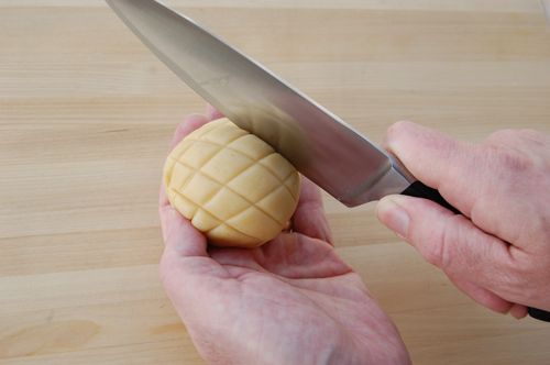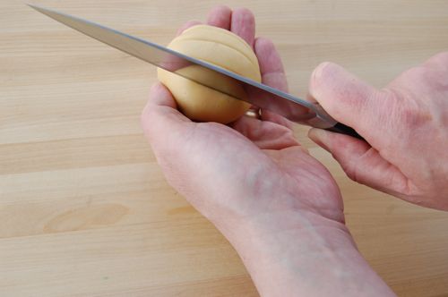 Now then, with a chef’s knife score the top using a gentle see-saw motion, rolling the knife over the bun. First in one direction…