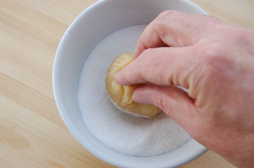 Holding the bun by the bottom (it’s OK to pinch the dough), roll the top from side to side in some granulated sugar…
