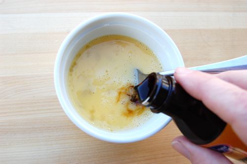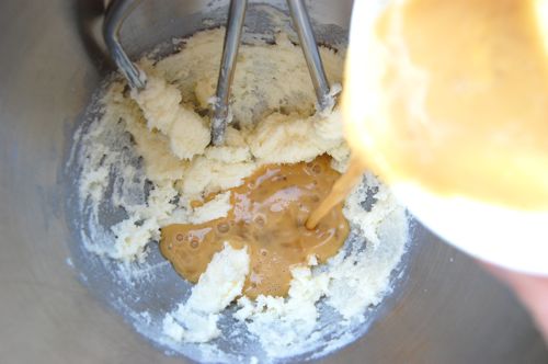 Add the eggs to the butter and sugar mixture in two additions, scraping the bowl as necessary.
