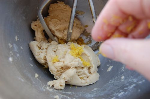 After a couple of minutes something resembling a cookie dough will form. Add the lemon zest to it and stir about 20 seconds more to incorporate it.