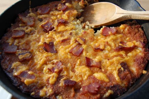 Bake 15 minutes until it’s starting to brown, then sprinkle on the rest of the bacon and cheese.