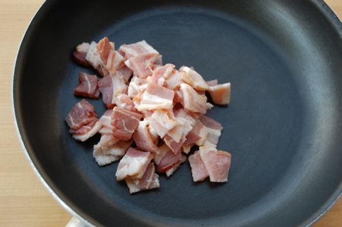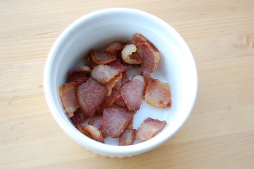 When the bacon is lightly crisped (but not quite done to the degree I want) I take out about half. This is the bacon I’m going to sprinkle on top toward the end. The rest I’ll keep cooking a bit.