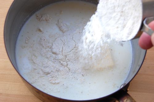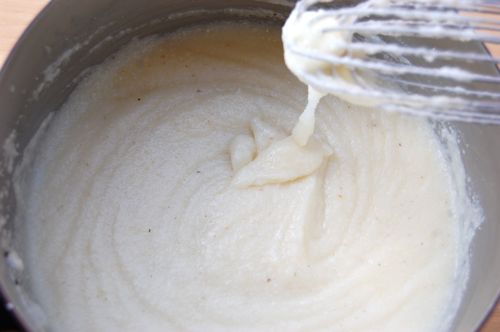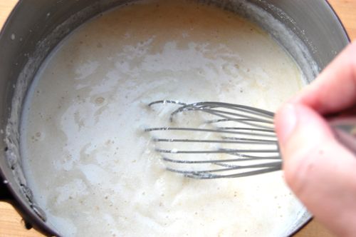 “Mielie” in Afrikaans means “corn.” As for “pap”, that’s not hard to figure out: “porridge”, “gruel” that sort of thing. This version is clearly not a gruel, souped up as it is with honey, but more than that bacon and cheese (which make everything taste better). My 4-year-old, who’s mad for all things corn — cornbread, tortillas, tamales, arepas, you name it — couldn’t get enough of this and had to be restrained lest she exploded. Begin by turning your oven on to 375 degrees Fahrenheit. Next combine the milk, buttermilk, honey, butter, salt and corn meal in a saucepan.
