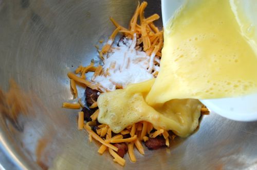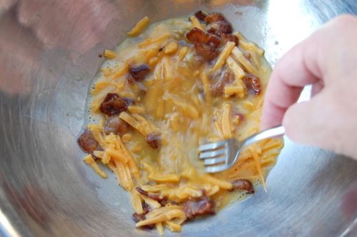 When the remaining bacon is done to the degree you like, strain it and remove it to a medium bowl. Add half the cheese, the baking soda and the beaten egg.
