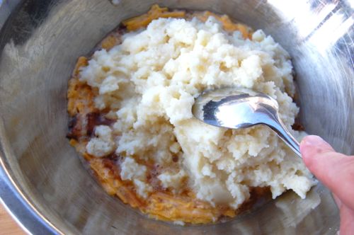 Stir all that together and press it into a 8″ square baking pan or a small 8″ cast iron skillet.