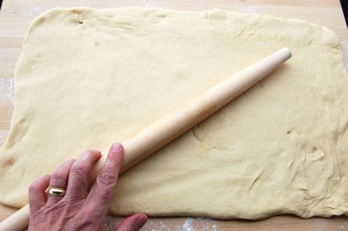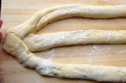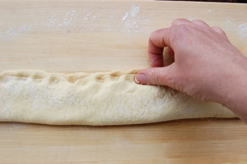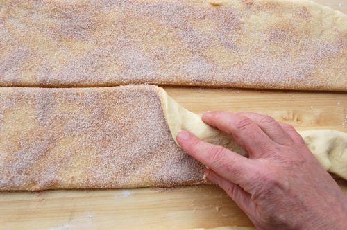 …and pinch them shut. Here I should say that cinnamon sugar isn’t your only filling option here. A thin stripe of pastry cream or frangipane can be spread down the middle of each strip, then enclosed. Some people use cream cheese, but I’d discourage that unless you were using a sweetened cream cheese filling à la cheese Danishes. I’m told cheese and cherries are popular. Oh, and did I mention that this is the time to add your dried fava bean or little plastic baby?