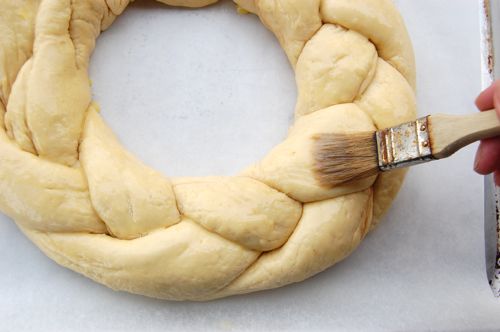 Slip the cake onto a piece of parchment and the piece of parchment onto the back of a sheet pan or a cookie sheet without a lip. Why? Because the cake ends up being bigger that the pan when it’s baked and you need to give it room to expand. Now paint the cake with egg wash and proof it for about an hour until it’s puffy.