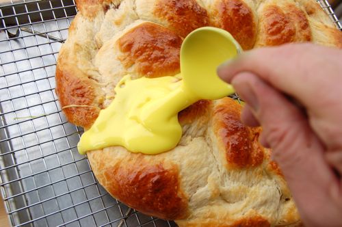 Brush it with more egg wash before it goes in. Bake for 20 minutes, rotate the pan, and bake about another 15 until it looks about like this. Sort of ugly, yes? But that’s what happens when you bake up a very yeasty, quick-raised bread. You get lots of expansion. The newly exposed areas don’t have egg wash on them, which means they don’t brown very well. But that’s why God created icing.