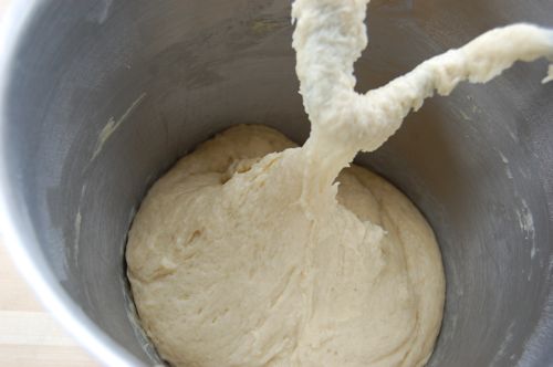 Knead for about 8 minutes until the dough comes together in a slightly sticky ball. If it’s too sticky, add a little more flour, but remember that the finished dough will be slack and greasy no matter what.