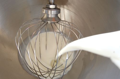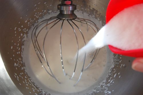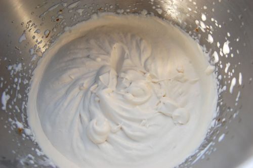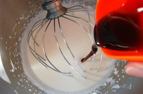 Whip another ten seconds (you’ll probably be getting close to soft peaks by now) and pour in the melted gelatin.