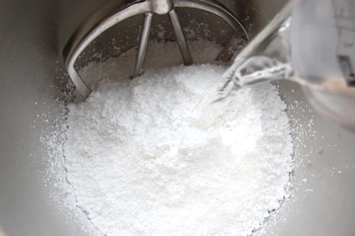 For every pound of powdered sugar, add three ounces of water and mix by hand in a bowl or in the bowl of a mixer fitted with a beater (a whip will introduce too much air into the icing).