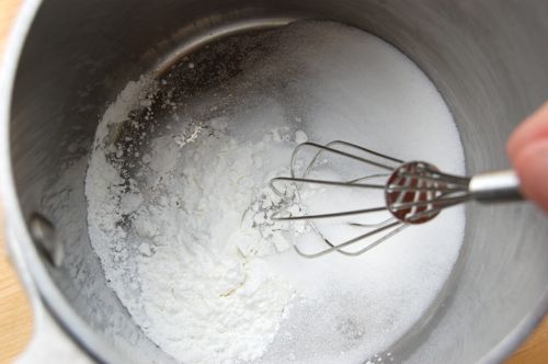 Start by combining the dry ingredients in a small saucepan. Whisk them together. The littler the whisk, the better.