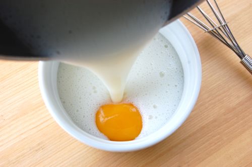 Pour about a third of the mixture over your egg yolks to temper them (i.e. gently bring them up to temperature)…