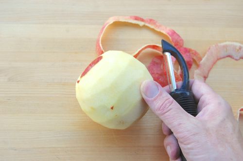 I strongly encourage you to try one this season. Start by assembling your ingredients. You want about six pounds of gala or golden delicious apples. This way you’ll end up with the five or so pounds you need for the actual filling. Peel them all the way around with a vegetable peeler.