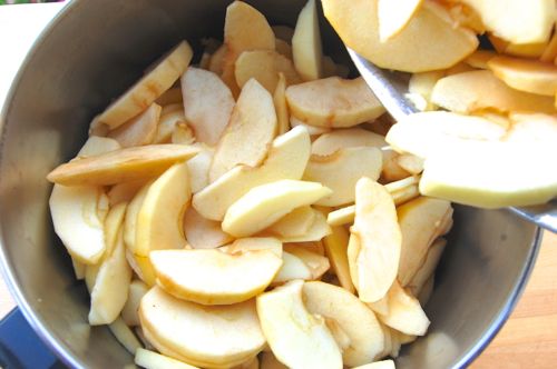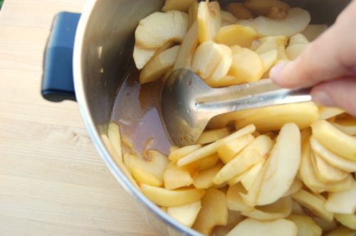 Add the apples and toss everything together. Once you hear the apples sizzle a bit put the lid on the pot and let them cook for 10 minutes.