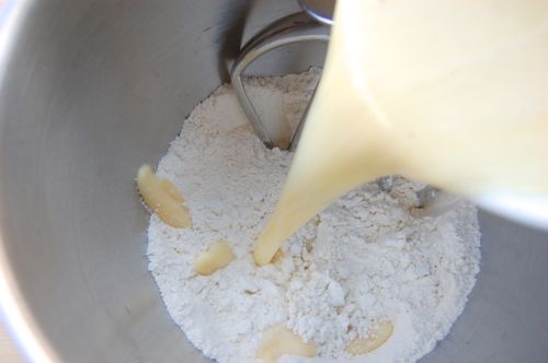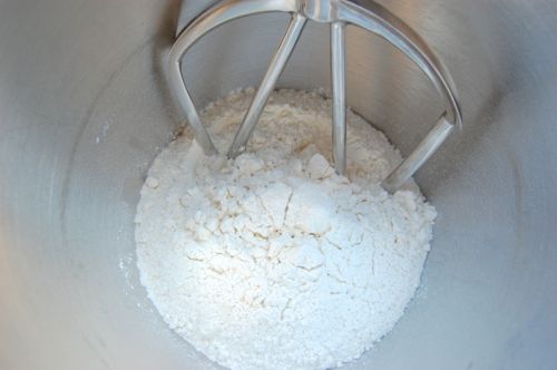 Combine your flour and salt in the bowl of a stand mixer fitted with a paddle. Stir it on low for about 20 seconds.