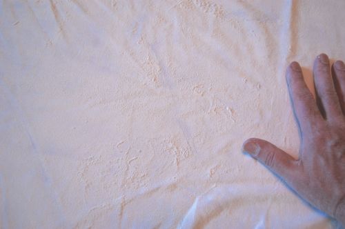 Dust it liberally with flour, but more than that, rub the flour into the fabric where you expect the dough sheet to be. Like so.