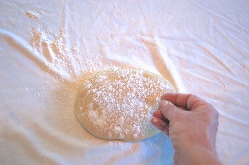 Now for the rolling. Remove the dough from the bowl and wipe any residual oil off the bottom with a paper towel (you’ll thank me later when it’s laundry time). Dust it with flour on the top.