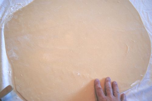 Or you can use your palms. I prefer the palms because I can open my fingers if need be to expand a small area. But experiment for yourself. It gets fun after the initial feeling of terror. Just move slowly and deliberately in smooth motions. Like you’re doing t’ai chi or something. And if you get a tear or two, no worries. Just move to a new part of the sheet. The strudel will still roll up fine.