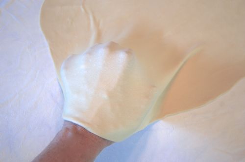 As you go you’ll notice that the thinly stretched regions of the sheet are looking lighter in color than the thicker areas. To stretch those out you’ll need to get further underneath. There are a couple of techniques you can use. You can use the backs of your hands and/or fists: