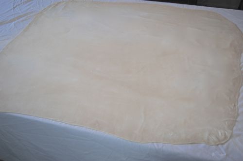 So OK. You’ve got a mass of dough in the middle of your dining room table and it’s time to stretch. You’re thinking: can’t some little old Slovenian lady come over and do this for me? Nope, they’re all off making kolacky this week, so it’s all up to you. Just begin slowly. Go around the edges and tug gently. Not so difficult…and the sheet is actually getting bigger.