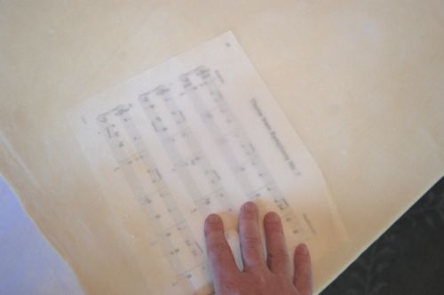You want it thin enough so you can see a printed page through it. Here we have some of little Jo’s piano music. You’ll be amazed at how easy it is to stretch the dough this thin.