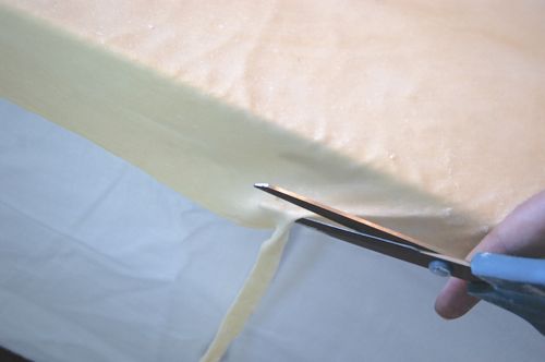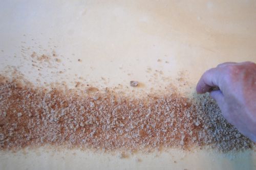 The filling-side edge of the dough should be hanging over the table just a bit. When you’re ready to lay the filling down, go around with some scissors and trim off the very edge. It’ll be dark and thick (no good).