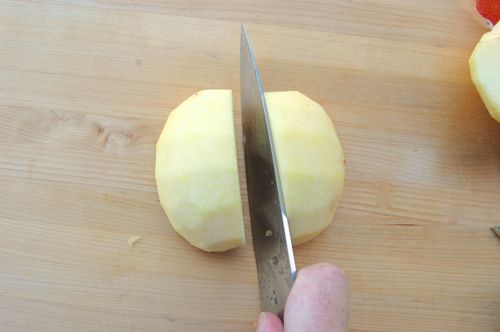 …then slice each half into 4-5 slices. Slice inward toward the center, angling the knife upward as you go.