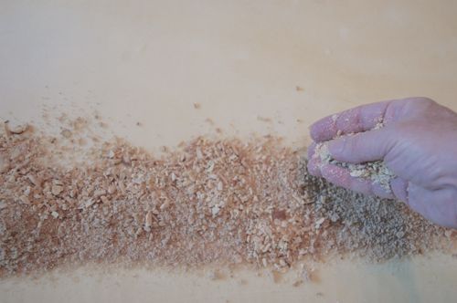 Begin the filling by laying down your bread crumbs. These are some “white” wheat bread slices that I ground up in the food processor and dried on a sheet pan last night. They worked perfectly.