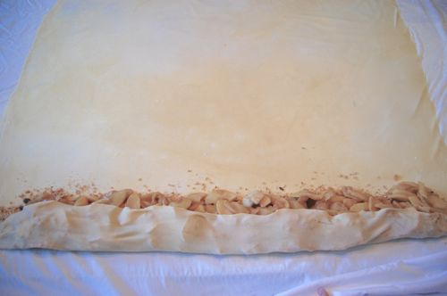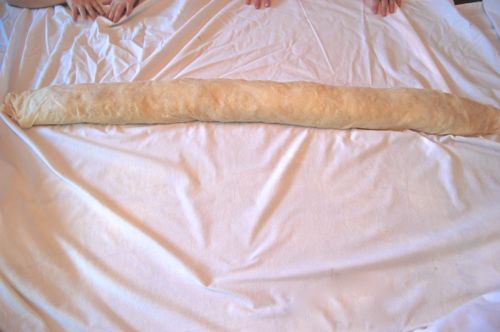 Successful flip. Gather up the sheet behind the strudel and repeat the motion, easing the whole thing over…and over…and over again…