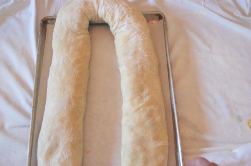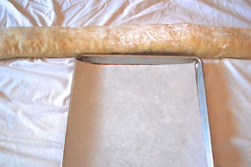 You’ll have a nice long stripe of filling. Make it as wide or narrow as seems appropriate. You can worry about getting it on the pan later.