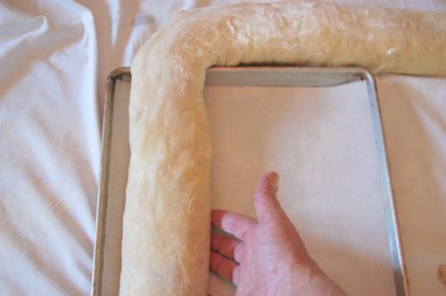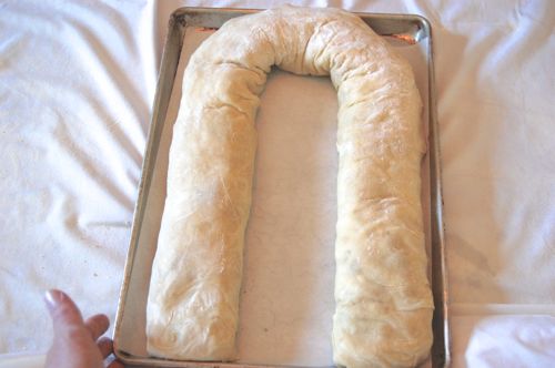 Here I should insert that there are lots of ways to go here. If your strudel is long and skinny you can make an “S” shape. You can make a shallow “U” if it’s very short and thick. If you have a really odd shape or thickness and can’t get it into a sheet pan, then slip it onto the back of a pan…or the backs of TWO pans if it comes to that (in which case, get a friend or family member to help you ease the whole thing into the oven). There is no set shape for a strudel.